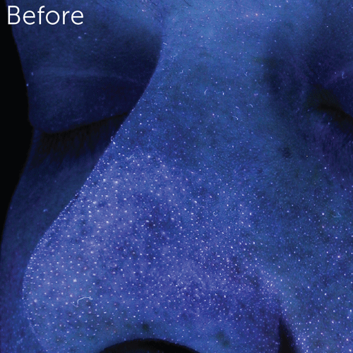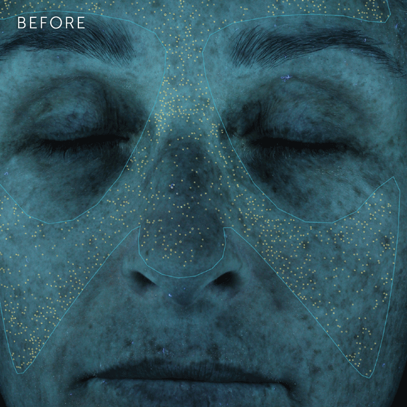 In order to track the effectiveness of our products, we use a VISIA® Skin Analysis System to run before and after skin analyses. After the VISIA has completed a scan, the software’s algorithms detail feature points on the user’s skin such as pores, redness, and wrinkles. We can then compare not only the before and after images, but the before and after data for each type of feature.